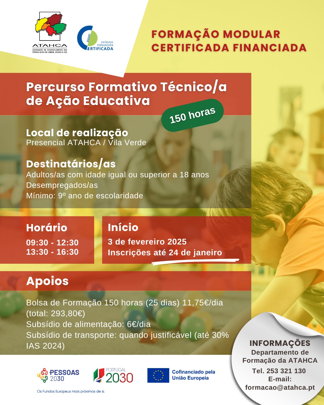 O Município de Terras de Bouro informa que a ATAHCA irá promover o Percurso Formativo de Formação Modular Certificada Financiada: Percurso Formativo Técnico/a de Ação Educativa de 150 horas, que tem como destinatários pessoas com 18 anos ou mais, com 9º ano de escolaridade completo e em situação de desemprego.